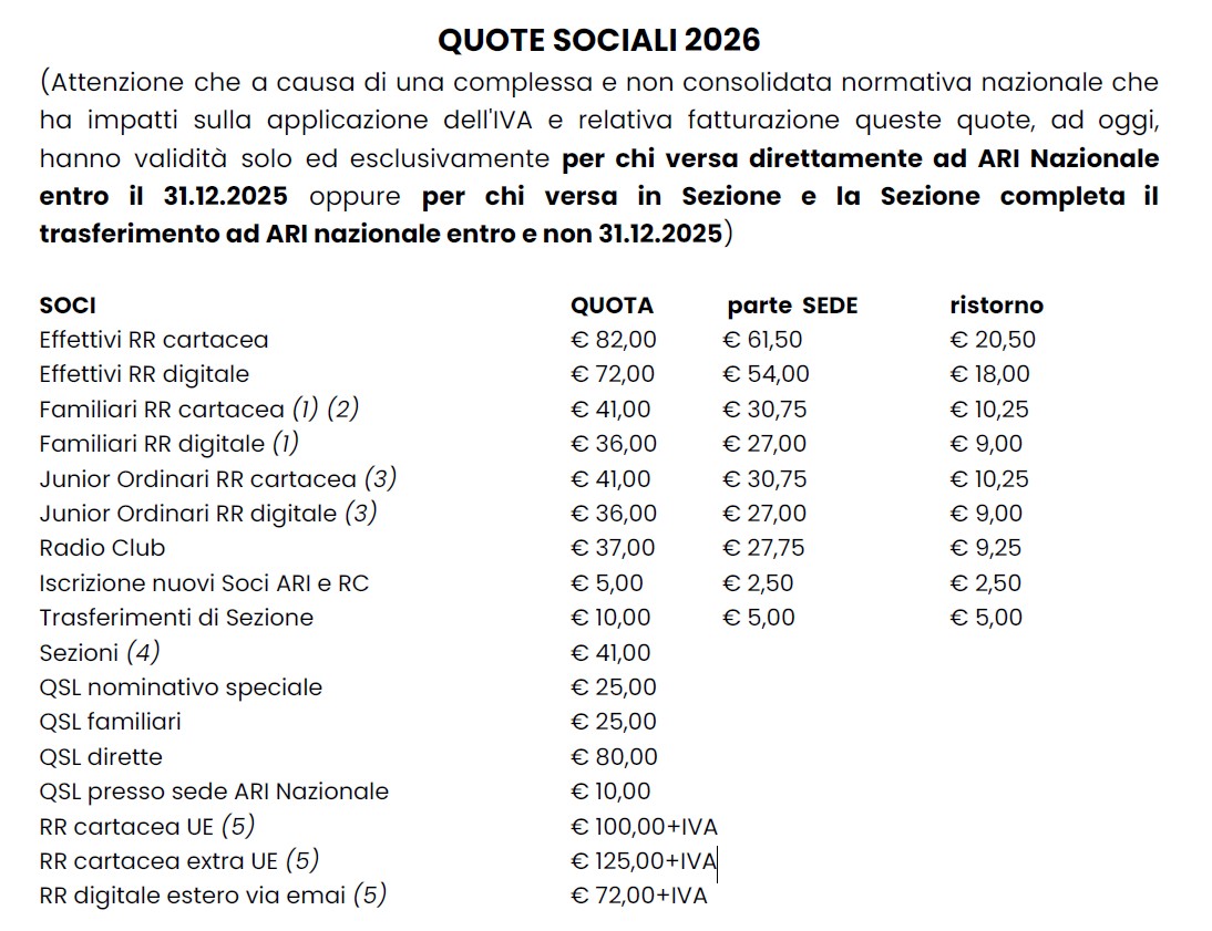 Chi per svariate ragioni non potesse effettuare il pagamento in Sezione può eseguire un bonifico sull'iban n. IT65R0318501400000010277788 Intestato a: ARI Sezione di Genova OdV